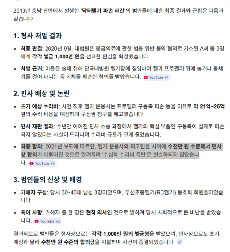 [ 단국대병원 닥터헬기 파손사건은 형사재판에서 피고인 3명에게 벌금형이 확정됐고, 민사사건은 최종적으로 5천만원 지급 화해권고가 확정된 것으로 정리됩니다. 언론 보도에 따르면 대법원 최종 판결은 2020년 9월 2일 확정됐고, 벌금은 각 1천만원 수준이었습니다 ]